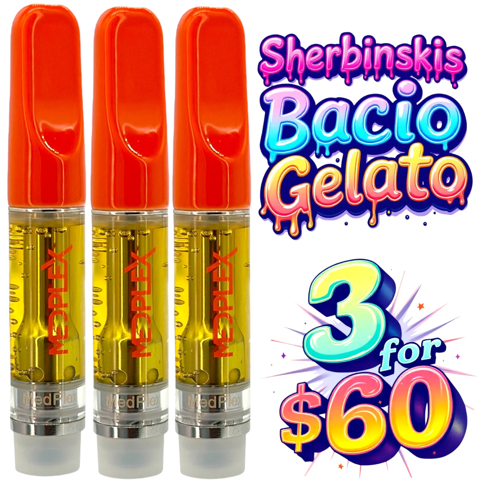 Sherbinskis Bacio Gelato THC blend vape cartridges features full spectrum cannabinoid profiles and terpene blends conceived to give you the maximum effects.