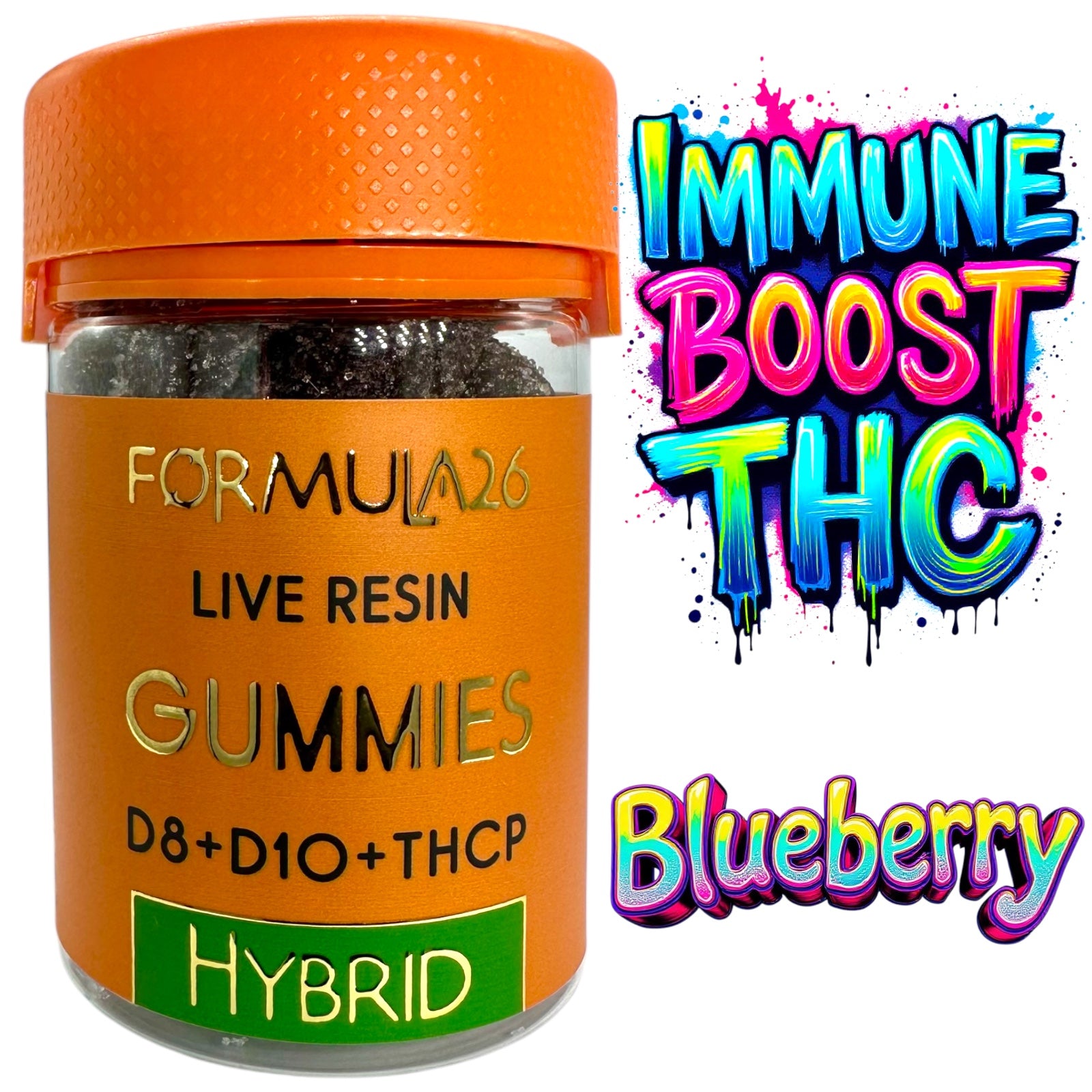 What's in it?     immune boost gummies were made with your wellness in mind, it is the ultimate high THC gummy, and we mean HIGH!!  Each gummy boasts 300mg of a proprietary THC blend including kca delta 8, delta 9, delta 10, thcp, loaded with vitamin C and functional mushrooms like reshei, chaga and lions mane to boost your immune system with antioxidant properties.  Limited production Spring 2025.